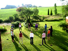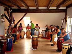 Frauen-Percussion-Reisen mit tollen Begegnungen an einem geomantischen Ort der der Ruhe und Kraft. Wo Draussen-Sessions mit Body-Percussion und lagerfeuer möglich und gewollt waren (s. Foto) Es gab sogar Fitness, Nordic-Walking und NIA im Begleitprogramm.