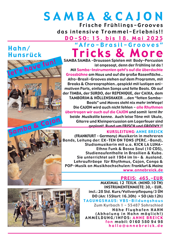 und SAMAB...viele Specials, wie Meditieren, Elfenwanderung, Candomble special: Breaks, Kleinpercussion-Happening. angeleitete Sessions.....